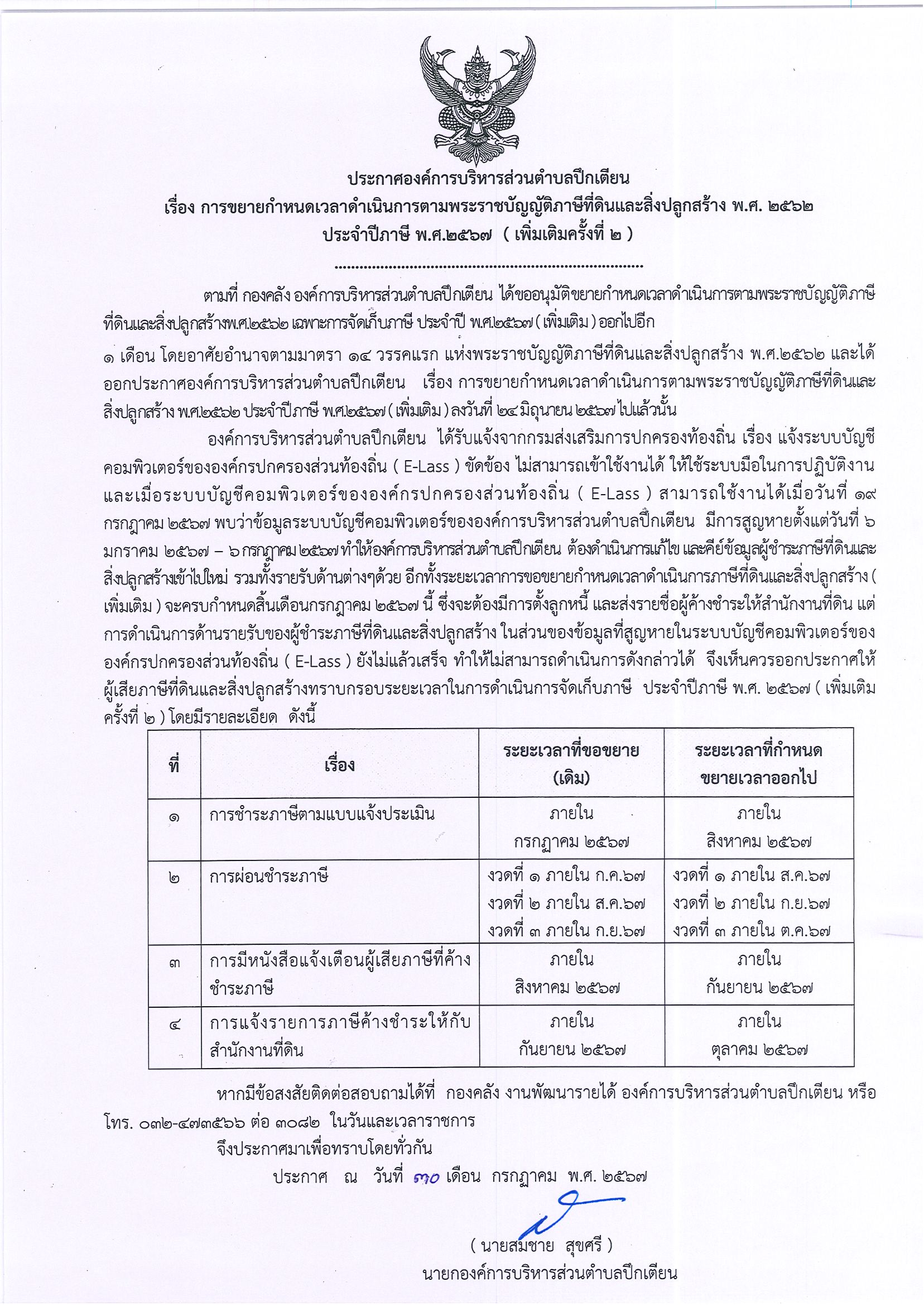 ประกาศการขยายกำหนดเวลาดำเนินการตามพระราชบัญญัติภาษีที่ดินและสิ่งปลูกสร้าง พ.ศ.2562 ประจำปีภาษี พ.ศ.2567 (เพิ่มเติมครั้งที่ 2)