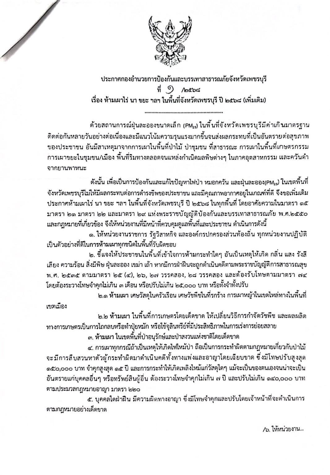 ประกาศห้ามเผา ไร่ นา ขยะ ในพื้นที่จังหวัดเพชรบุรี ปี 2568
